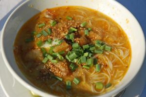ミャンマー東部にある州「シャン」とミャンマー語で“麺”という意味がある「カオスエ」から名前が来ています。麺は米粉で出来ており、ベースはチキンスープとなっています。