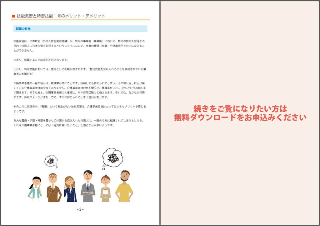 「介護職種における技能実習と特定技能1号の違い~在留資格の違いとメリット・デメリット~」では、介護事業者の皆様や監理団体および登録支援機関に向けて、在留資格『技能実習』と『特定技能1号』をピックアップし、介護職種における2つの在留資格の違い、メリット・デメリットについて徹底解説いたします。